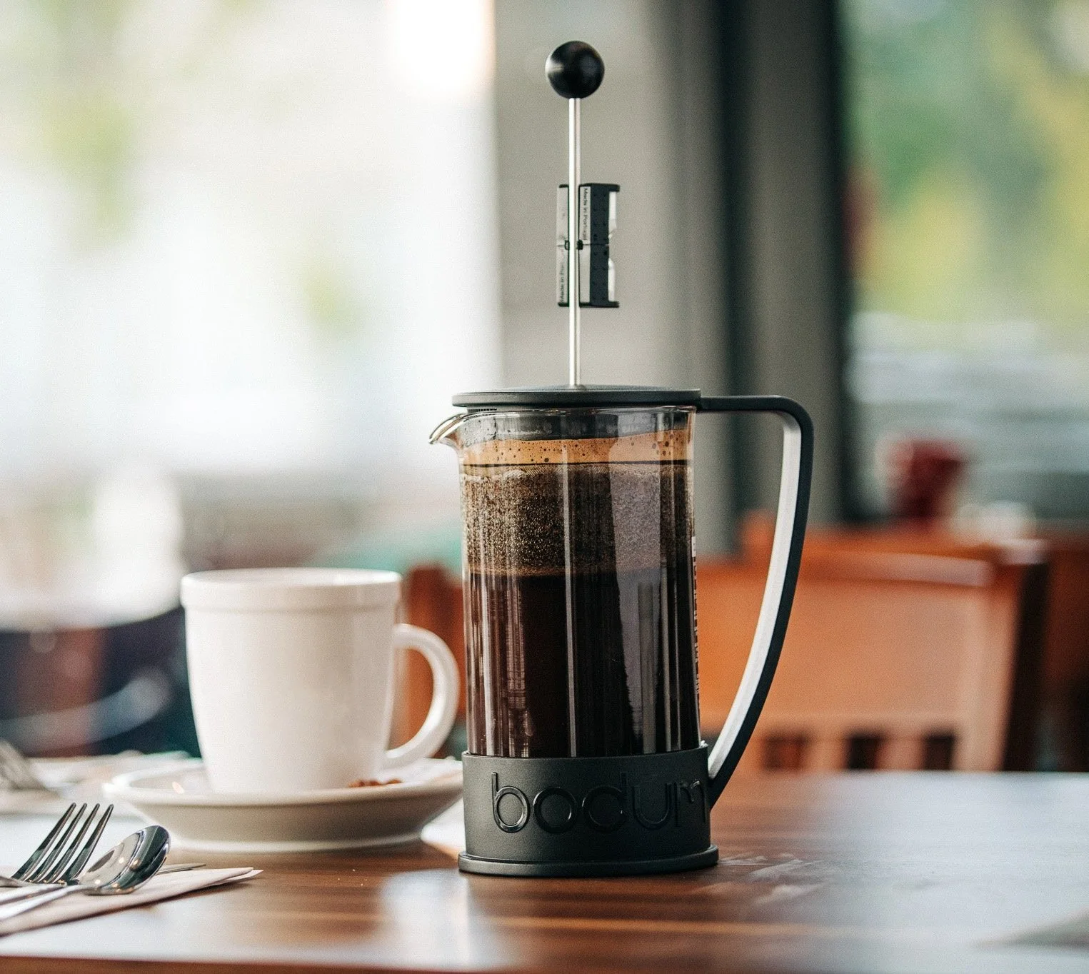 8. Slowly press down on the plunger to separate the coffee grounds from the freshly brewed coffee.